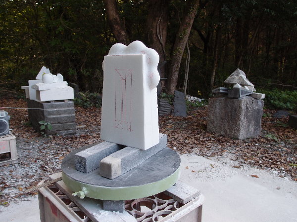天気になったときに、ローマストーンのアールを出して研磨を掛け、台座にも穴を開けて本体を固定します。