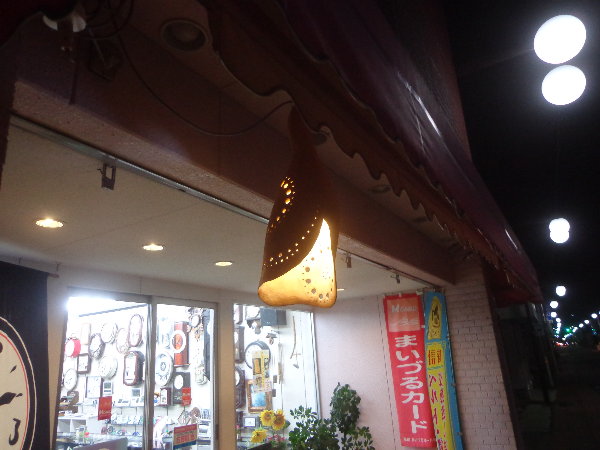 ☆まず伊地知菜美さんの制作した木彫のあかりオブジェをとみた時計店に設置しました。