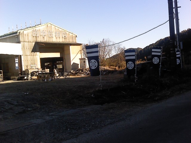 ☆午後から仕事場へ行くと、石材店の道路沿いに剣菱マーク(秋月藩の紋章)の幟がはためいていました。