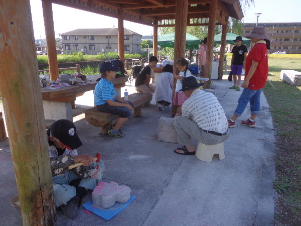 杉尾さんは照明器具を組み込む空間を作るために、小林氏の指導で石割の作業を進めました。