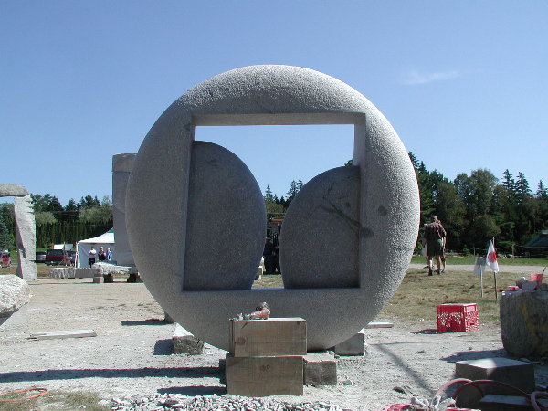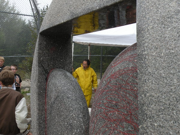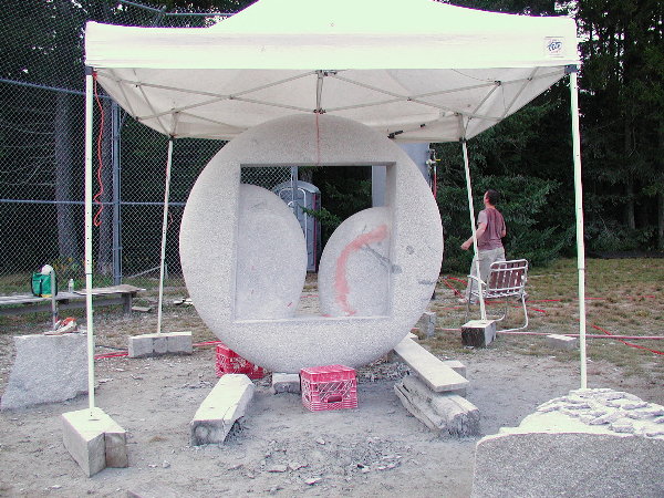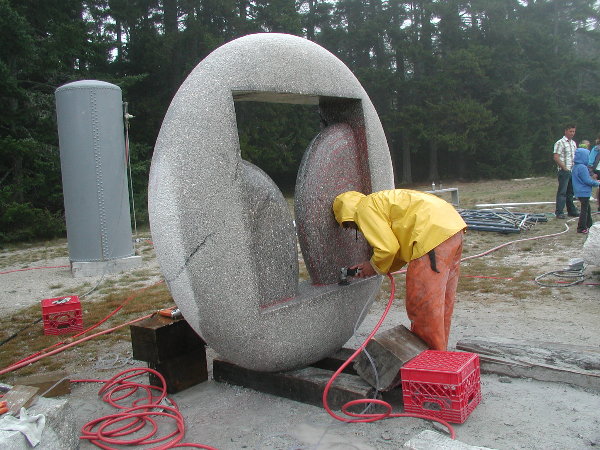 ☆朝のうちにサインを入れ、台座の上に無事に設置し、ハツリ部をノミで調整して作品は完成しました。