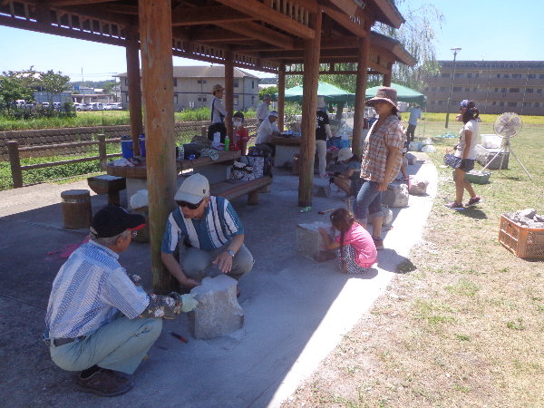猛暑が続く中、昨日はあかりオブジェ公開制作の併催行事、石彫教室を開きました。