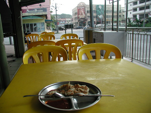 今朝の朝食。レストランと言ってもこんな風なテラスで摂ります。向かいのビルの並びがホテルです。
