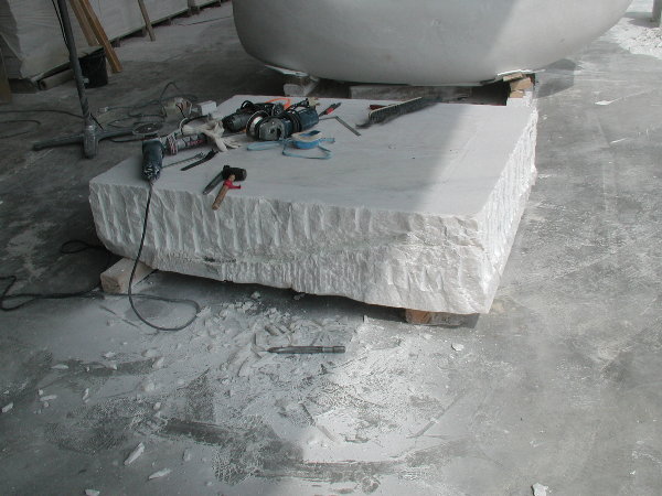 ☆さらにもう一つの切削した台座も全くレベルが出ておらず、形も平行四辺形になっています。(Aslamが指示して従業員が切削)しかも切削機の上での石の返しにリフトを使ったらしく、全面にリフトの爪の突き傷と角欠け状態で、泣きたいほどの無残な姿なのです。これを全部修正していたのでは2日はかかります。明日の午後3時くらいにはすべての作業を終えて片付けや設置図面作成をしなければならないのに・・・・・完全に赤信号です