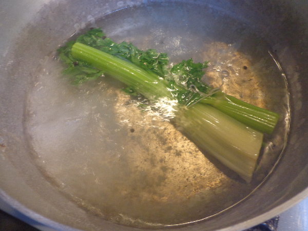 濃度15~20%の塩水を作り、沸騰させて、ブーケガル(香味野菜の束)と粒黒胡椒を入れて煮立てます。