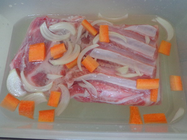 今日は一晩寝かせた豚バラを洗って血抜きをして、ピクルス液に漬けました。