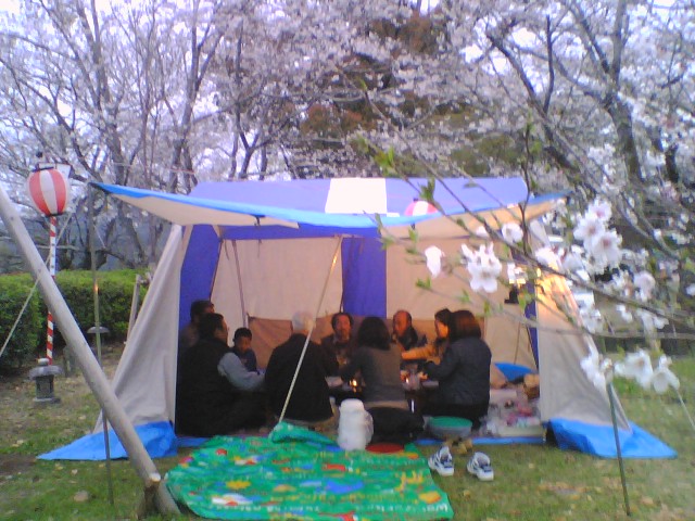 途中から一時的に雨になりましたが、準備のいい人がテントを用意していましたので、快適な暖かい花見となりました。