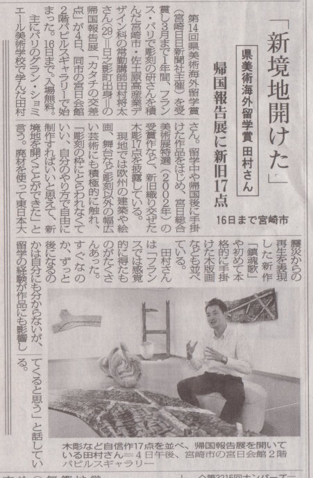 ☆昨日から、宮日会館パピルスギャラリーにて、第14回宮崎県美術海外留学賞でパリに1年間留学していた田村将太君の、帰国報告展が始まりました。