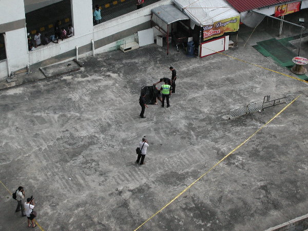 壁をまたいでダイブしたようだ、と手まね足真似で野次馬に説明している関係者らしいおじさんが居ました。自殺のようです。