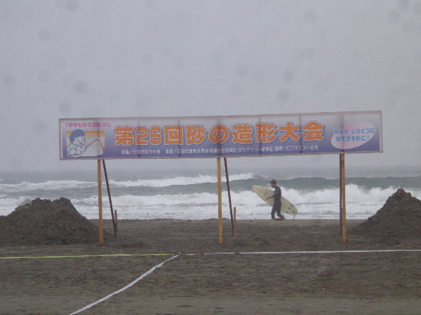 ☆今日は朝から雨ですが、この雨の中、日向市伊勢が浜で行われた第26回砂の造形大会(日向かぼちゃ会主催)の審査に出かけました。