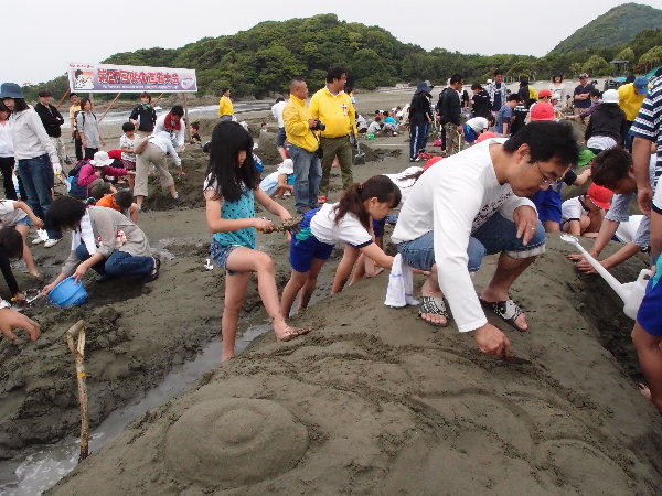 ☆今日は、日向市の伊勢が浜で第27回砂の造形大会が開かれました。(日向かぼちゃ会主催)