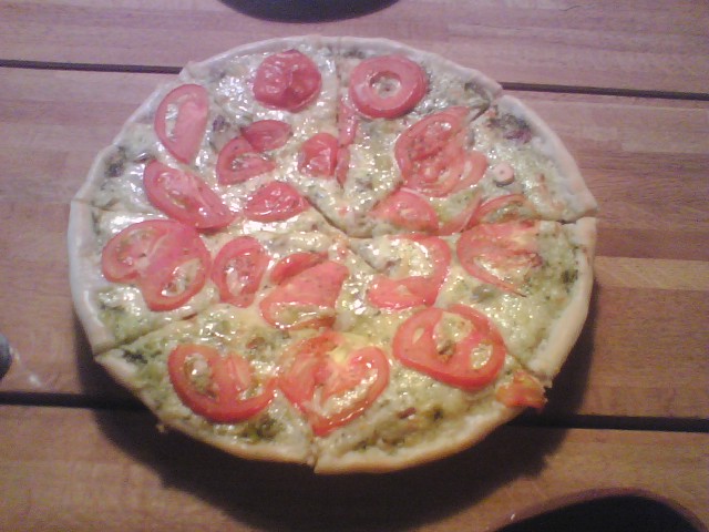 携帯の画像なので濁っていますが、実際はバジルとトマトと濃厚なチーズの色合わせがとても鮮やかでした。安物のチリの赤ワインと良く合いました。