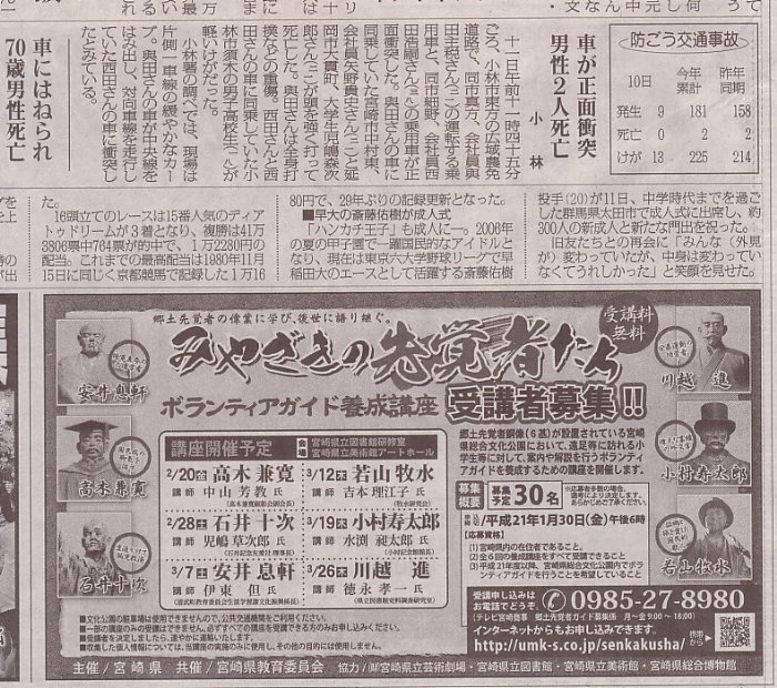 ふと下の欄を見ると宮崎県の広報記事で、宮崎県総合文化公園に設置してある郷土先覚者偉人像のボランティアガイド養成講座受講生募集の案内が掲載されていました。