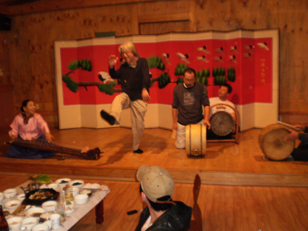市長代理のカンさんが来て宴会が始まりました。カンさんはショジュ(焼酎)とビールを割ったものを全員に一気飲みさせます。それが1周するとまた廻ってきて何度も一気飲みさせられてみんなハイテンションになりました。