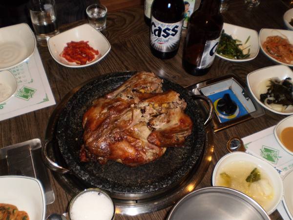 韓国ダック専門の店で、まずダックの石焼が出てきました。サムゲタンのように中にもち米や夏目などが入っていて、とても香ばしくて美味しく、おかげで最後の晩餐なのにみんな食べるのに夢中になって会話が弾みませんでした。