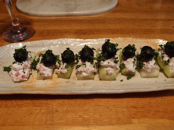 セロリとオリーブを使ったおつまみですが、濾過して水分を抜いたヨーグルトにサラミのみじん切りを加えたソースとの相性が抜群。セロリの強烈な香りがまったく気にならない、上品な前菜でした。