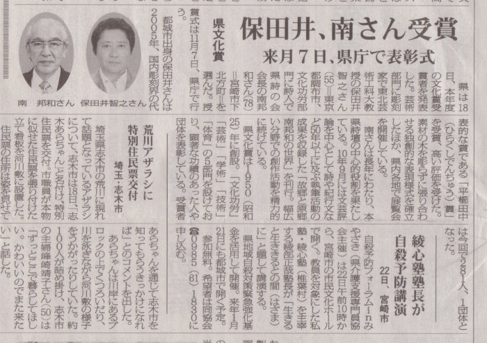 ☆今年の宮崎県文化賞の芸術部門の受賞者に彫刻家の保田井智之氏と詩人の南邦和氏が選ばれました。