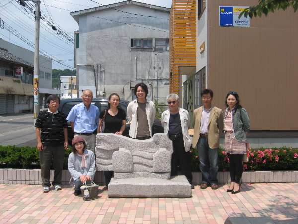 この中町彫刻のあるまちづくり事業は中町名店会の事業です。プレートは名店会の経費で作られています。台座は私のボランティアです。ですからこうして、名店会会長と敷地提供者と私が一緒になって彫刻を設置するというのは、まったく理想的な事業展開になります。