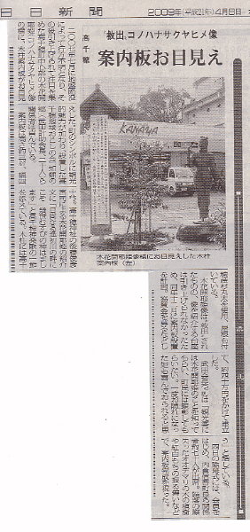 どれどれ、と新聞を覗き込むと、”救出”されたコノハナサクヤヒメ像は建立主旨の銘板のはめ込んであった台座石が引き上げられなかったので、高千穂地域おこしの会「智鋪の郷」が木柱の案内板を設置したというものでした。除幕式は盛大に行われたようです。