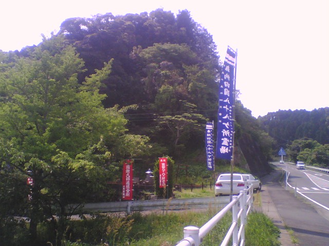 私が小さいころはこの右の山手の中腹に日当たりの好い小さな大師祠があって、今の時期の「おだいしさん」祭りのときはそこへ登っては、お接待のおにぎりなどいただいていました。美味しかった散らし寿司のおにぎりの味は今でも記憶にあります。その後、何回かこの山腹はがけ崩れにあい、いまでは鬱蒼と木々の茂ったままになり、昔の面影はありません。