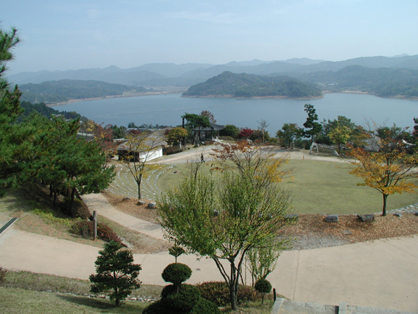 湖に沿った山並みには美術館をはじめ、韓国の民族村を再現した公園になっていて、非常によく手入れされた清冽な空気の漂う素晴らしいロケーションでした。