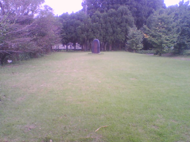 教会前の芝はとてもよく手入れされていました。奥の彫刻は私の作品です。