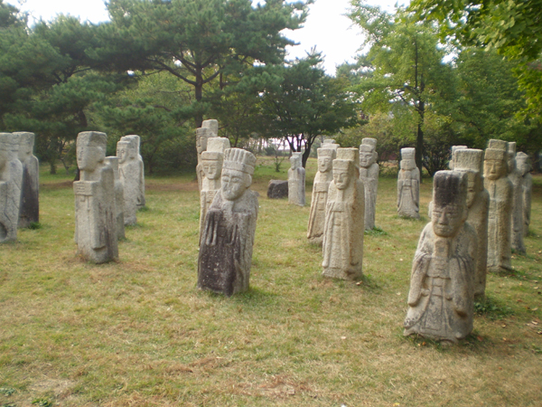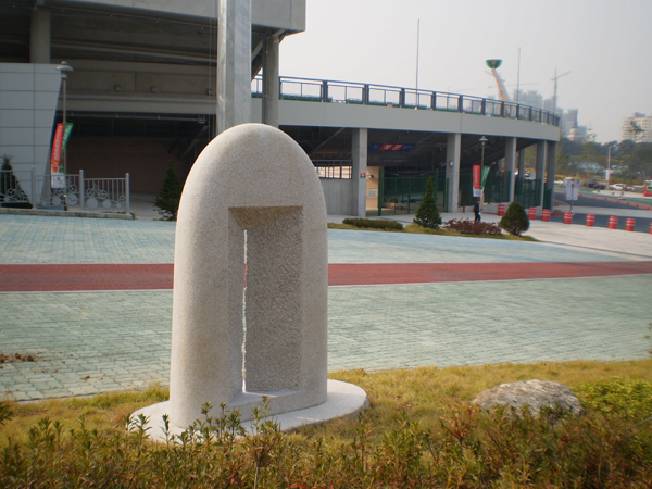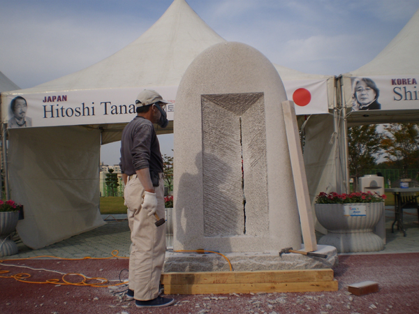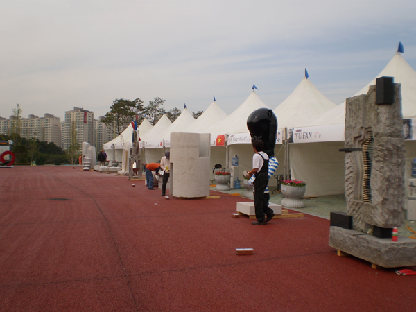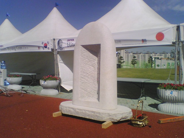 韓国は地震が無いから設置は簡単なものです。基礎の上に置くだけです。転倒の心配のある作品以外は基礎と作品の接着はありません。