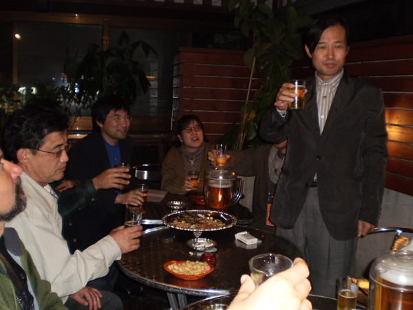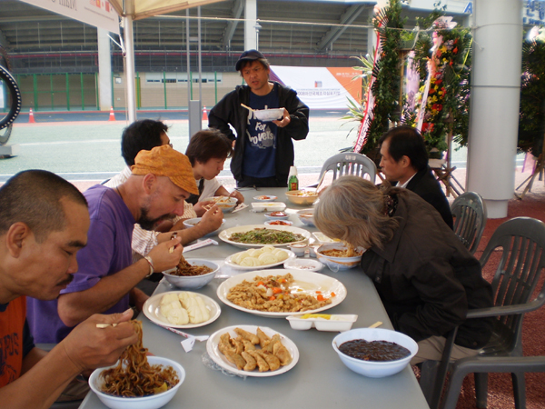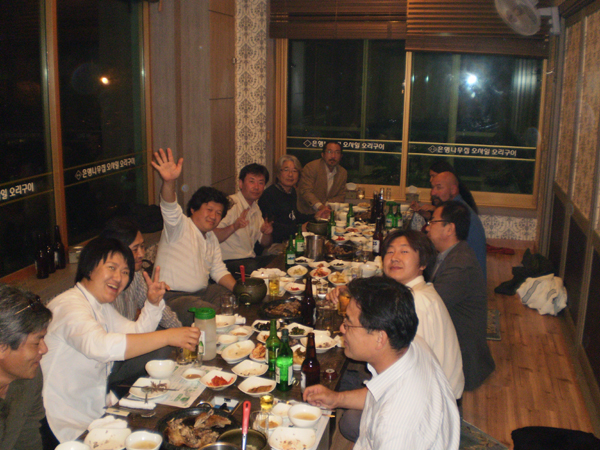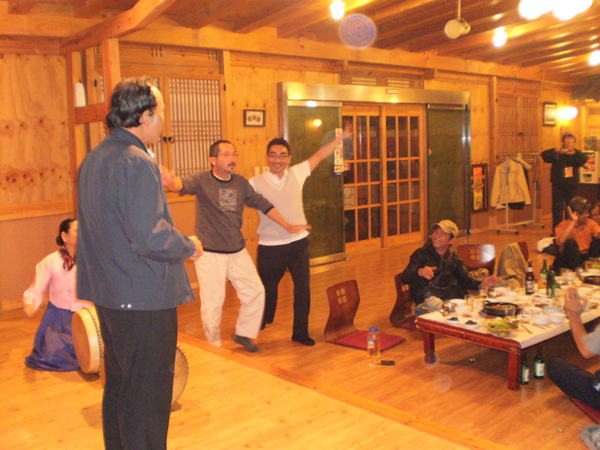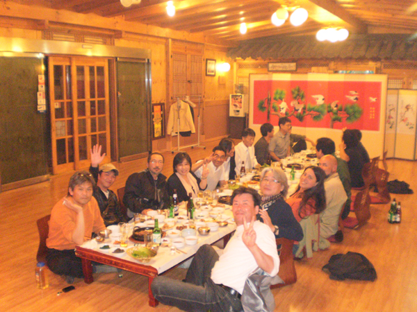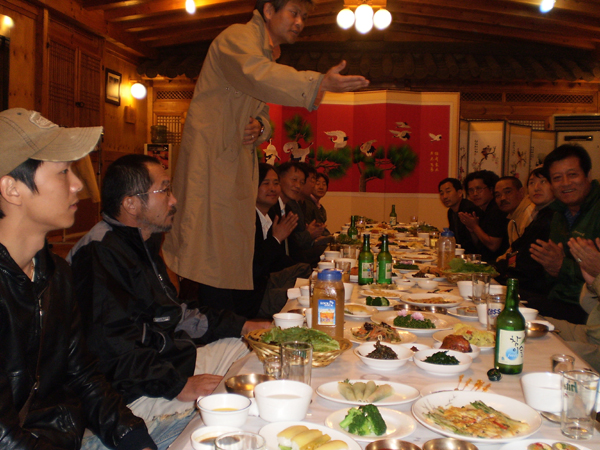 市長代理のカンさんが来て宴会が始まりました。カンさんはショジュ(焼酎)とビールを割ったものを全員に一気飲みさせます。それが1周するとまた廻ってきて何度も一気飲みさせられてみんなハイテンションになりました。