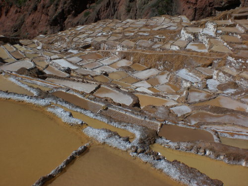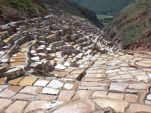 ”塩田はインカの時代から変わらず今も使われています。湧き出る温泉に塩分が含まれている様で、後は太陽の力で自然と塩が出来るのを待つという方法で、まさに自然と人間と時間が造り上げた芸術品といった感じでした。塩は乾季の6~10月ぐらいのみ取り出してる様です。一袋500gぐらいが40円で売られています。”と北川氏は記述されています。