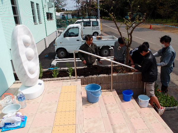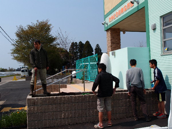 保育園に行くと、石井記念友愛社の児嶋理事長が友愛園の子供たちと植栽の作業をしていました。
