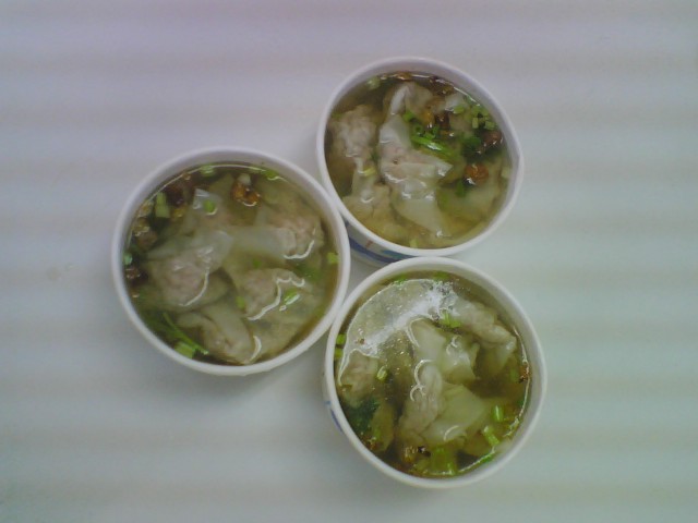 ワンタンは紙カップに入って出てきます。スプーンはあまりにもちゃちなおもちゃのような安物プラスティックのスプーン。一杯60元(約220円)。張さんのおごりでした。