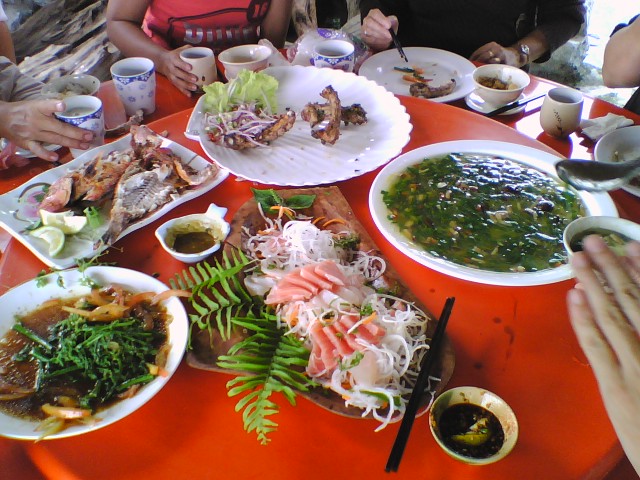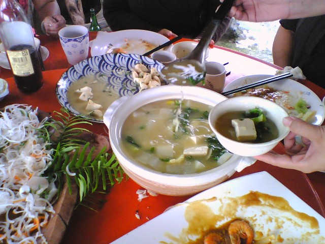昼食をとある奇妙な店に案内されました。漁師の手料理のような店で、しかも食べる場所は道路沿いのバッラク作りの貧弱なもの。でも交通部観光局の案内なので、なにかあっと驚く仕掛けのある隠れスポットだろうと思っていたら、やはり原住民阿美族の伝統的な料理だと言うことでした。