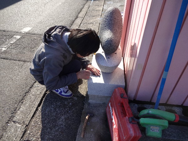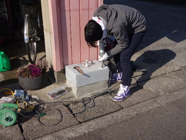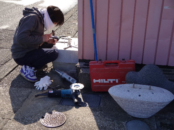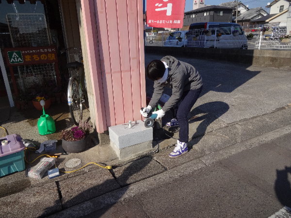 ☆あかりオブジェの最後の作業、縁石へ水路をつける作業を行いました。