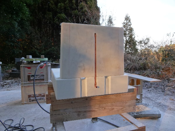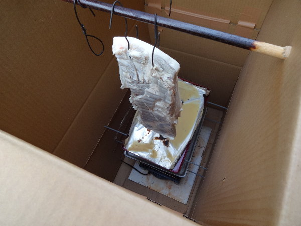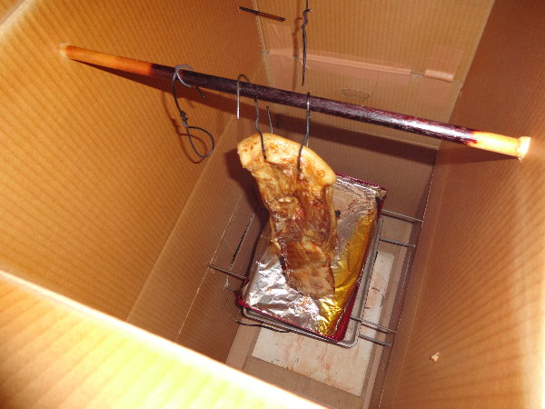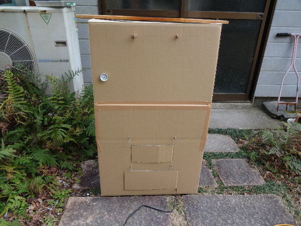 前回までのスモーカーでは、熱源に電熱器を使うと100度まで上がって、表面が焦げたような感じになるので、以前に作ってまったく温度の上がらなかった大きなスモーカーで燻製を掛けてみました。