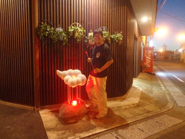 お隣の福岡生花店でも、通りがかりのおばちゃんたちが、”わあ、キレイ!”とあかりオブジェを覗き込んでおられました。