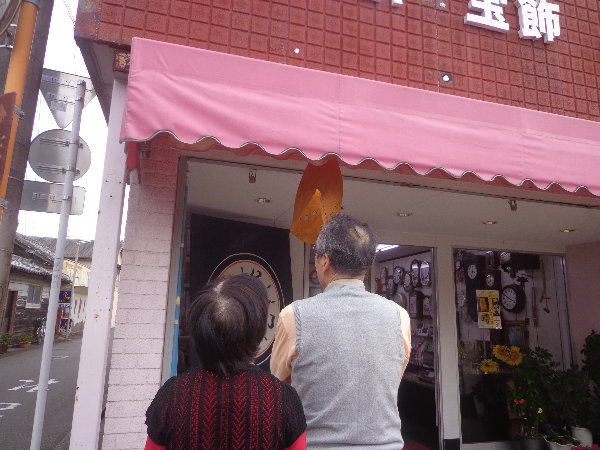 ☆まず伊地知菜美さんの制作した木彫のあかりオブジェをとみた時計店に設置しました。