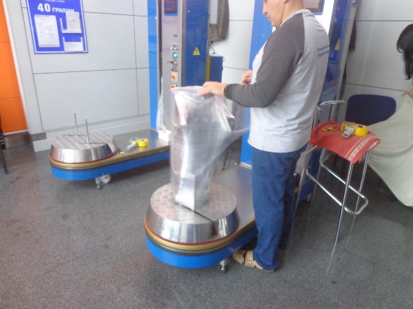 9時前にキエフ空港へ着き、まだ酔ったままの状態でチェックインをしましたが、問題の預け荷物は2個一緒にラッピングすればよいと言うことで、ラッピングサービスでラッピングしてもらい、100ドルものオーバーチャージを払わずに済みました。