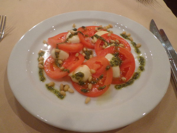 このトマトとモッツアーレチーズのサラダは、まぶされた松の実とバジルソースの組み合わせがとても美味しかったです。