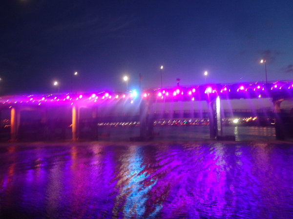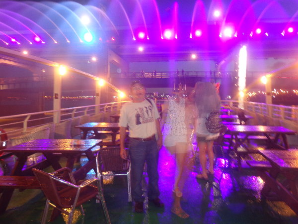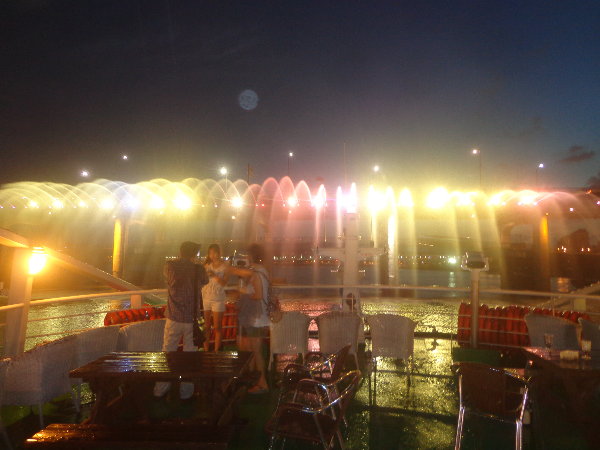 午後8時から、盤浦大橋の橋梁からのライトアップされた放水ショーが始まり、ちょうどその時刻に橋梁下を抜けた船上は放水の水を被ってずぶ濡れとなります。