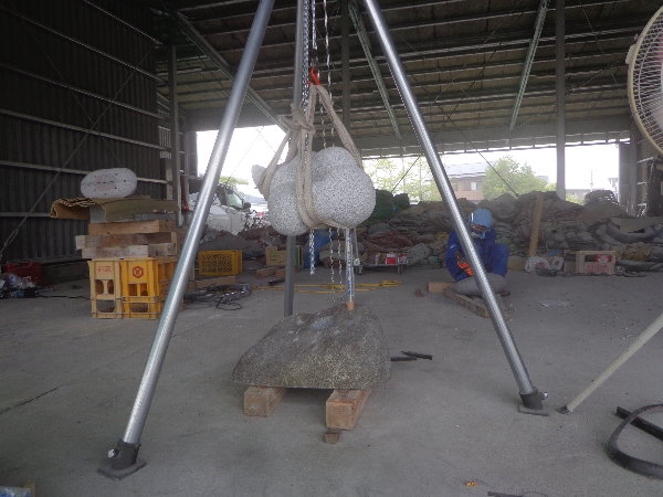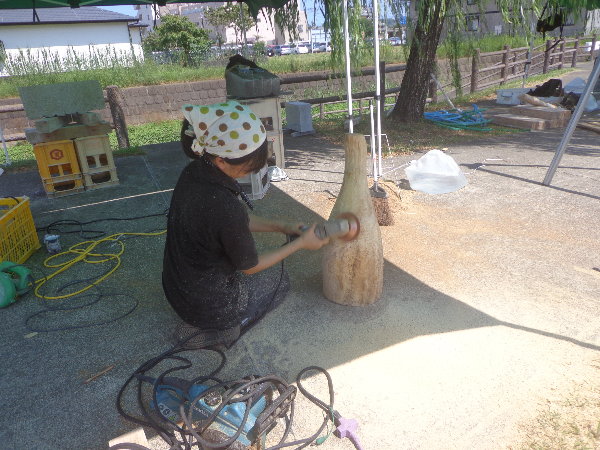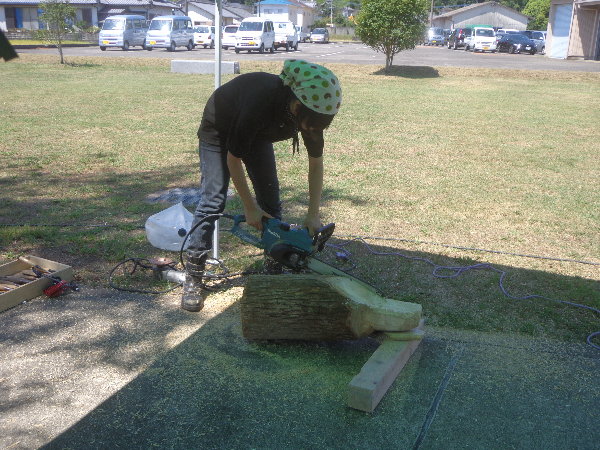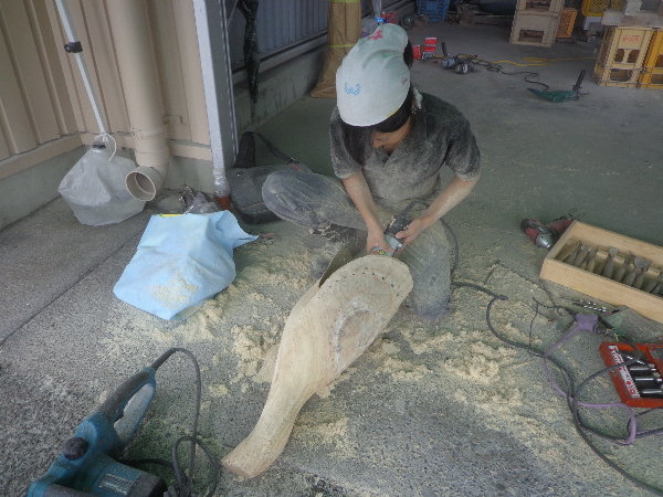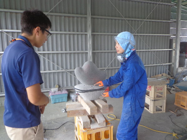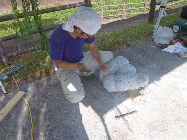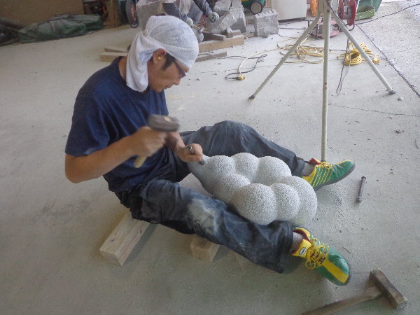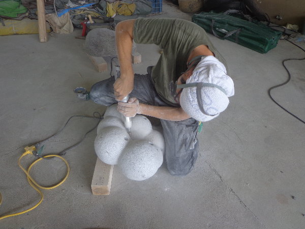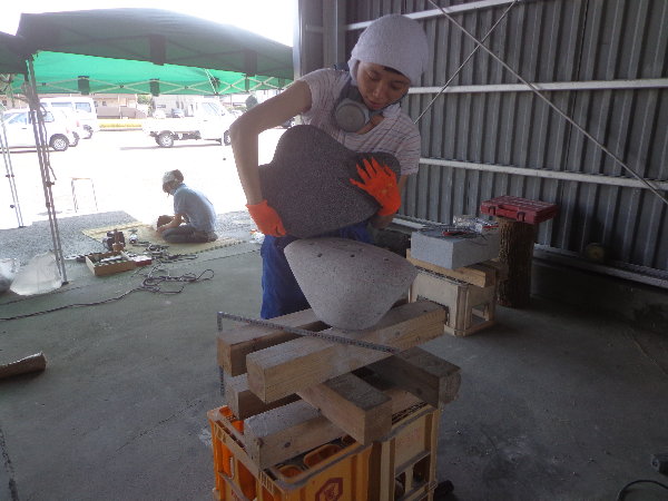 彼女は木彫作家ですが、今回は私のサポートで石彫に挑みます。