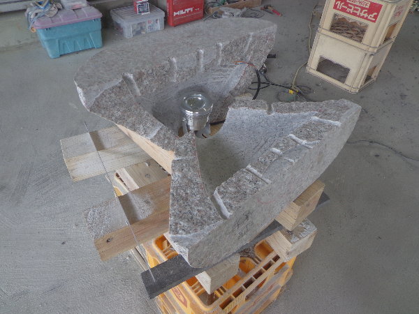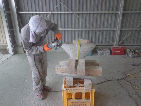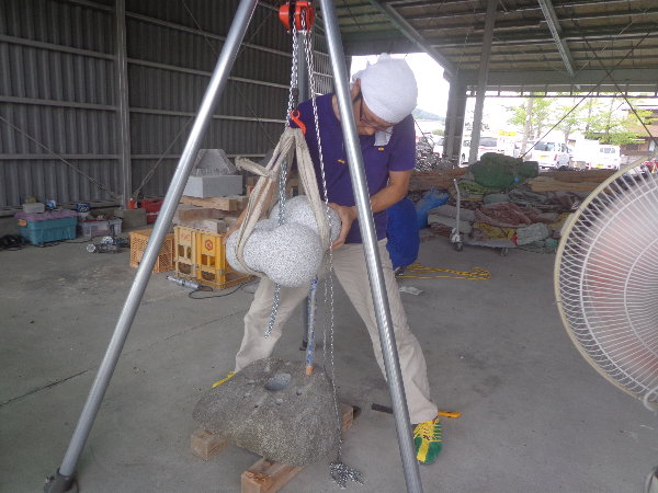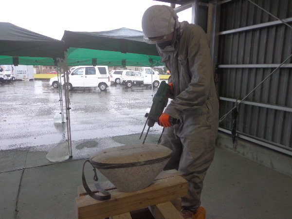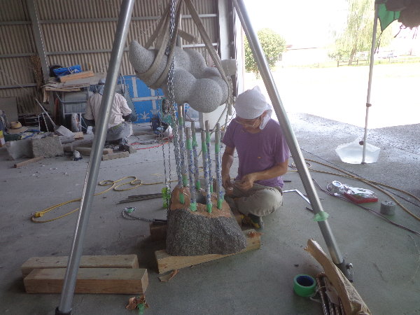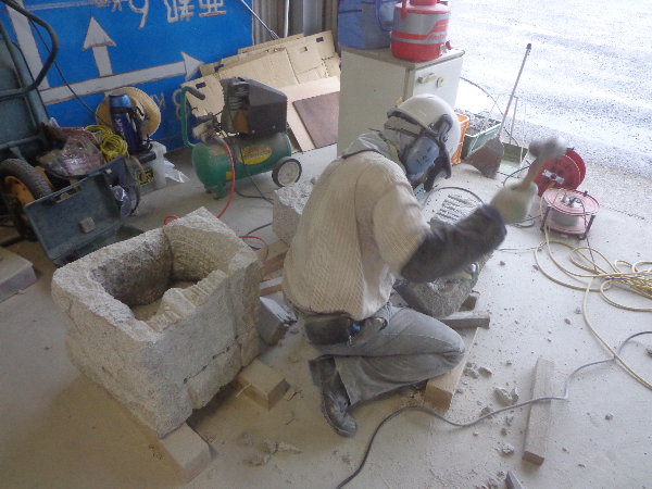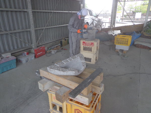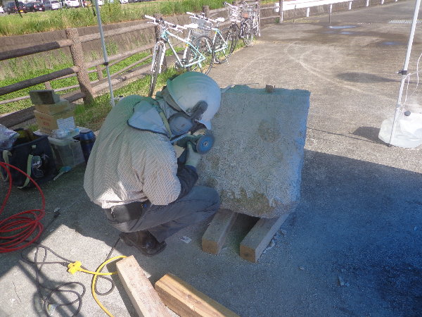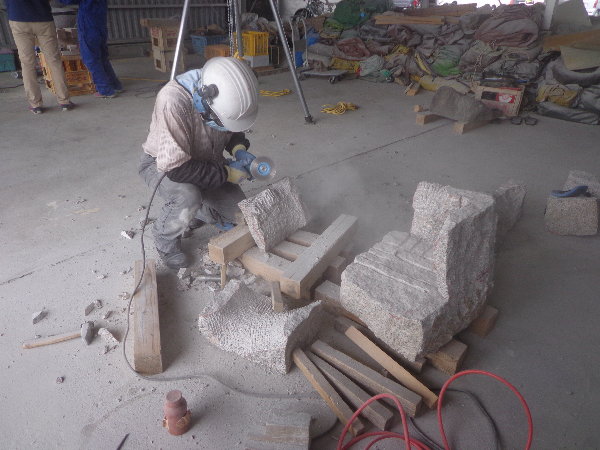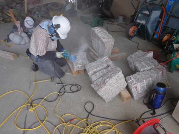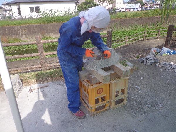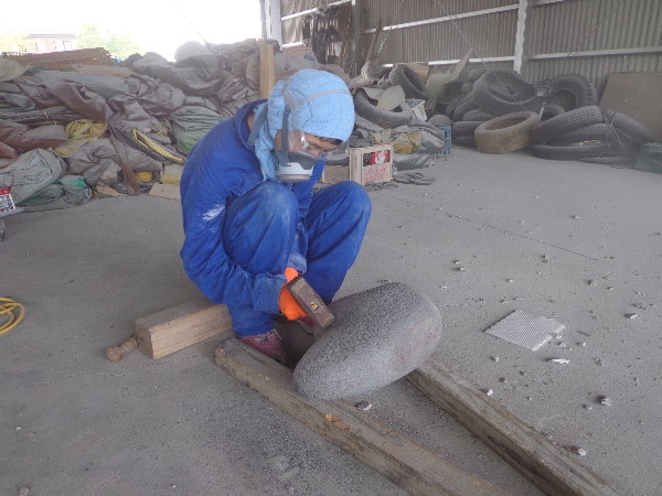杉尾さんは照明器具を組み込む空間を作るために、小林氏の指導で石割の作業を進めました。