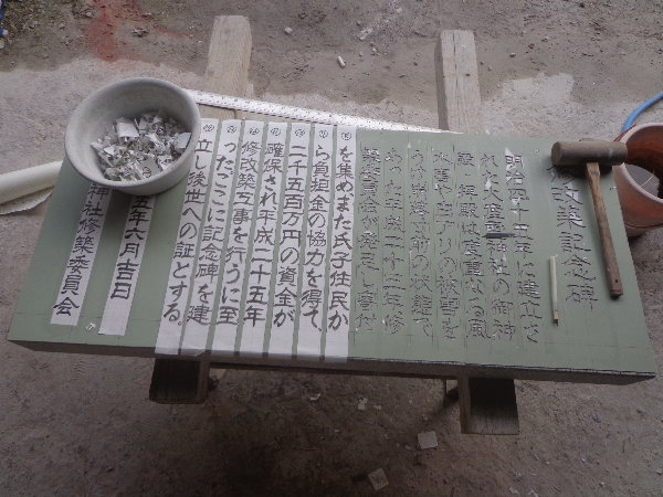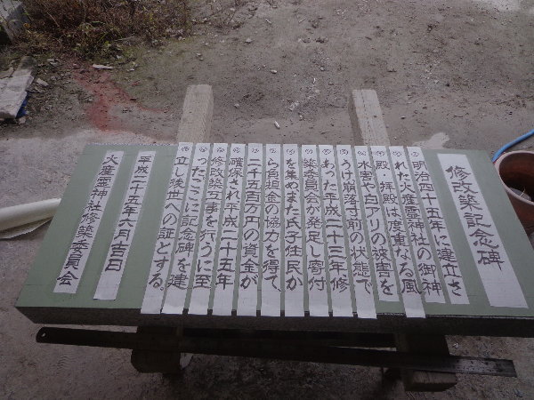 修築工事もほぼ終わる火産霊神社の修築記念碑を作らなければ成らなくなりました。