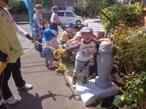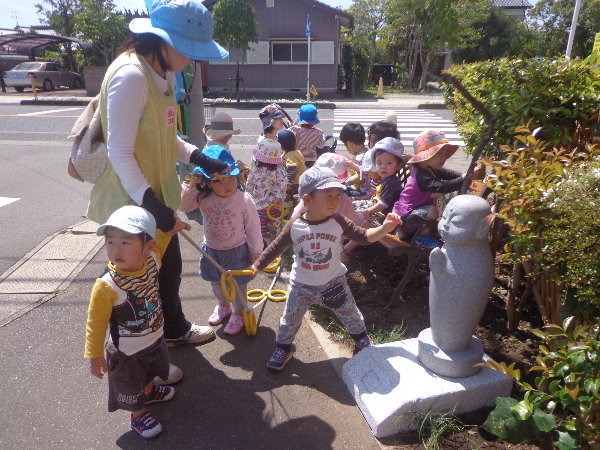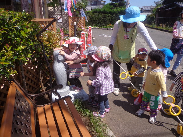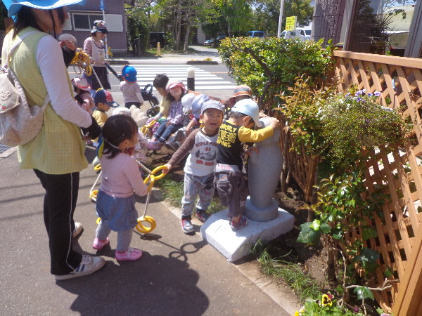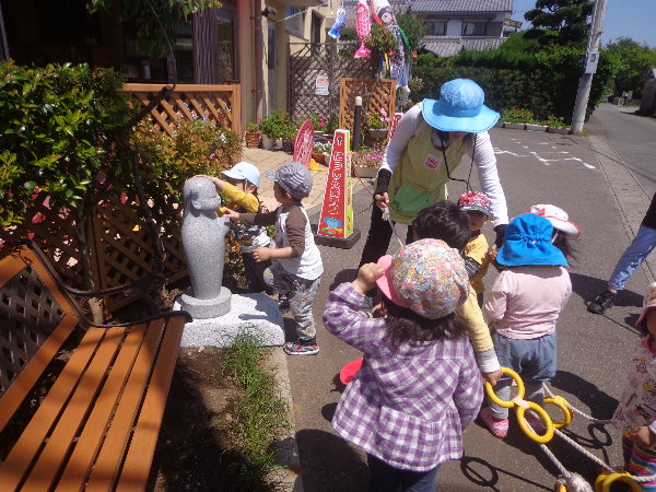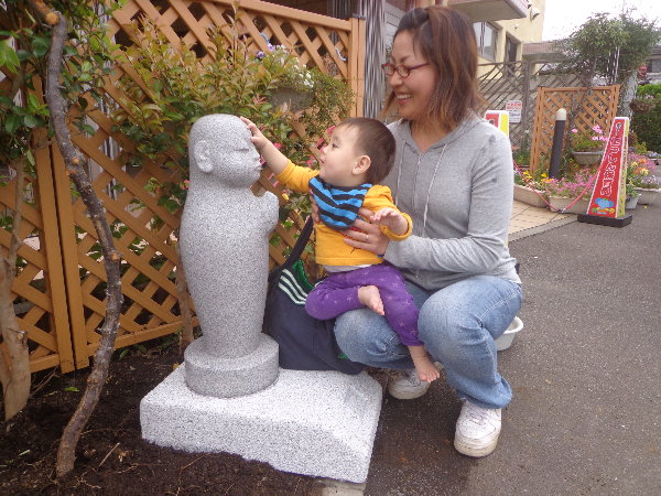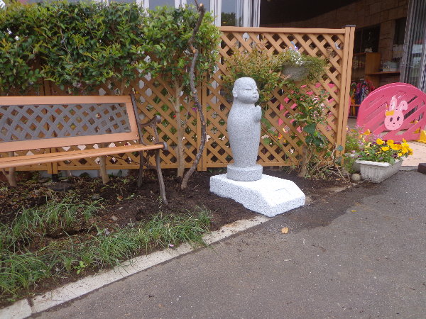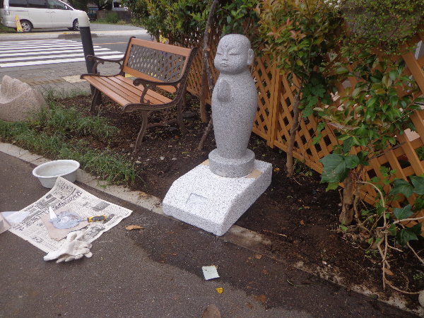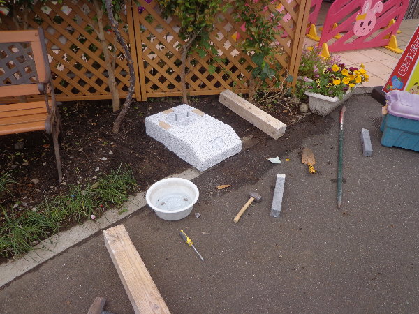 ☆昨日設置したお地蔵さんの台座下の目地を入れようと思って保育園へ行きましたが、まだ児嶋理事長が設置状態を見ていないので、理事長のOKが出てから固定しようということになりました。