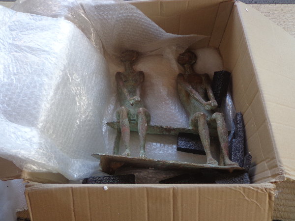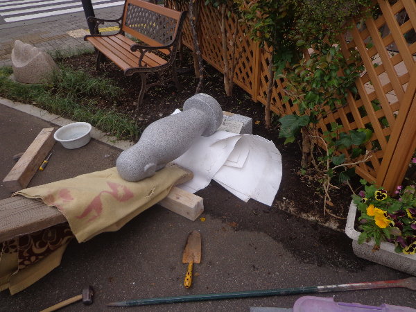 作品にはコンクリート台座との留め金はなく、モルタルを敷いて乗せてあったので、衝撃で作品が動いて衝撃の力が抜けて作品の大きな損傷を免れたのでしょう。