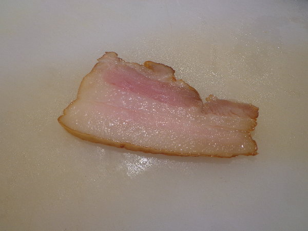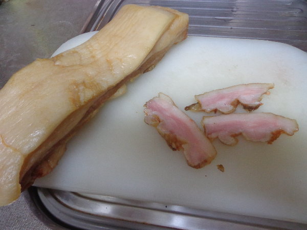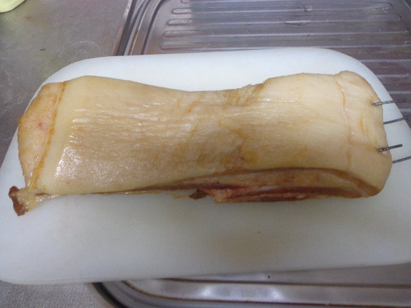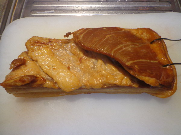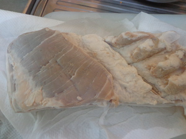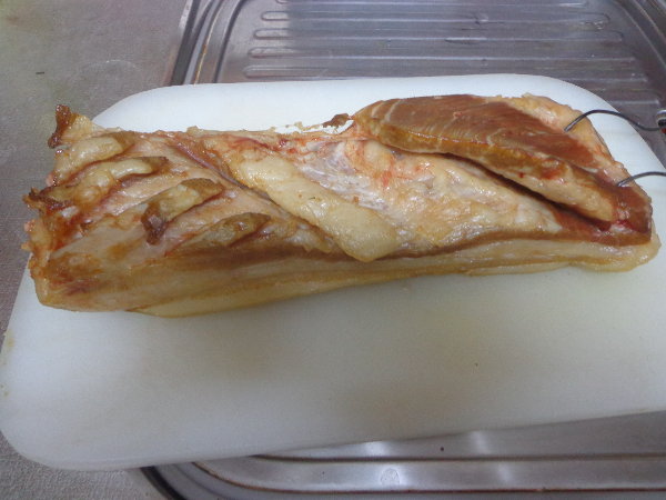 1週間ほどピクルス液に漬けこんだ豚バラ肉を、昨日の朝までに丸一日塩抜きをしました。少し抜きすぎた感じ。