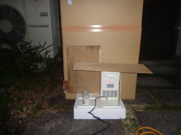 夜になって気温が下がってきてスモーカーの中の温度も下がってきたので、ファンヒーターの周りを閉じて炭も追加します。