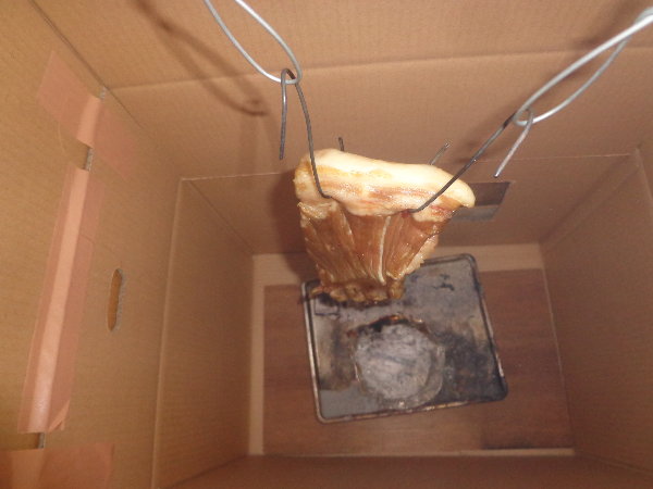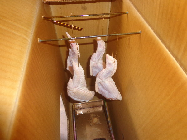 次に夕刻から前日のスモーカーにミニファンヒーターで熱風を送って50度まで温度を上げ、手羽先を吊るして小1時間ほど風乾させました。