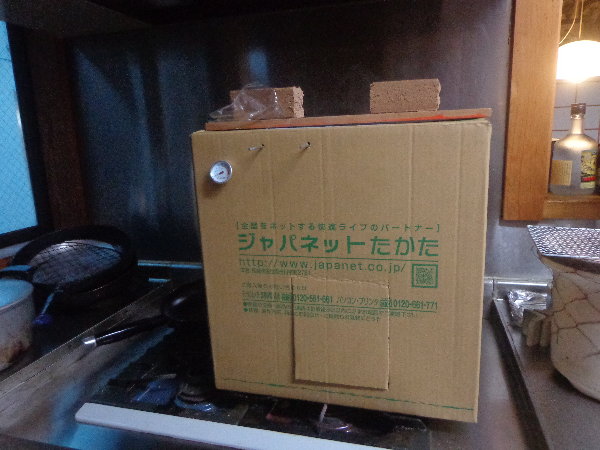 熱源無しでスモークがかかるように、そしてガス台の上でも燻製が出来るように、パソコンの箱でスモーカーを作ってみました。