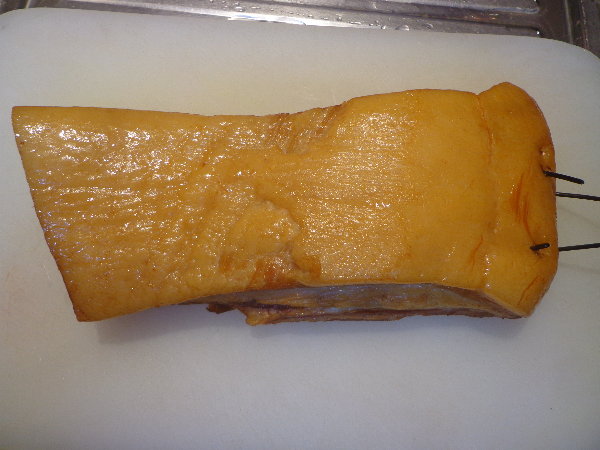 そこで手順が逆ですが、ボイルしてみました。(ネットで調べると、一度ボイルしてからじっくり皮が硬くならないように燻製するらしい)