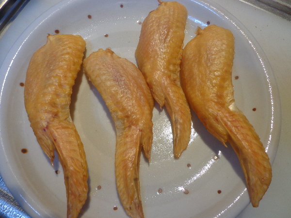 とてもいい色に上がりましたが、以前の経験で手羽先は燻製したばかりのときはヤニ臭くて、皮も硬くて美味しくありません。